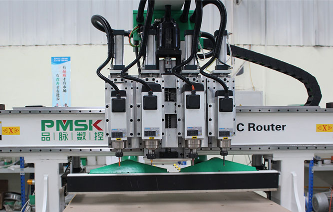 數(shù)控開料機(jī),機(jī)頭部位搭載四個(gè)主軸,在加工櫥柜時(shí)主軸上裝載的刀具分別為6mm,8mm,10mm,15mm。在打孔時(shí)四個(gè)主軸氣動(dòng)切換來解決所需孔位,在開槽和開料時(shí)兩個(gè)裝載6mm刀和8mm刀的主軸進(jìn)行加工,同時(shí)